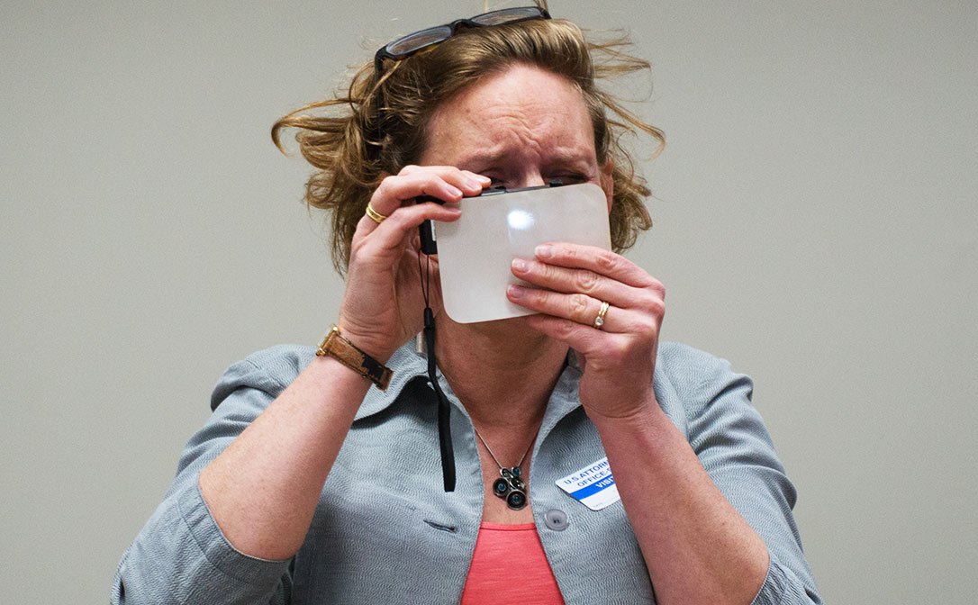 Siobhan Turner in the US Attorney's office working on the Rudy Kurniawan Case, shown using a jeweller's loupe to look for 'tells'