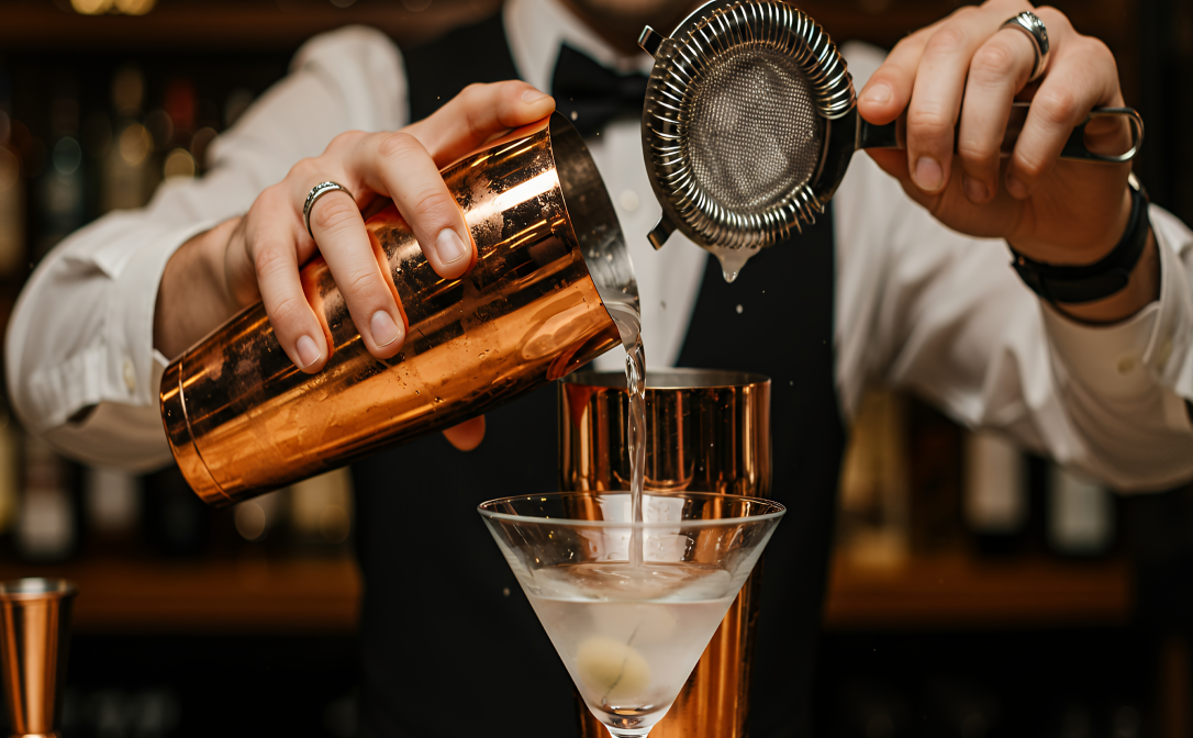 A martini being poured after it has been shaken - or stirred - with ice.