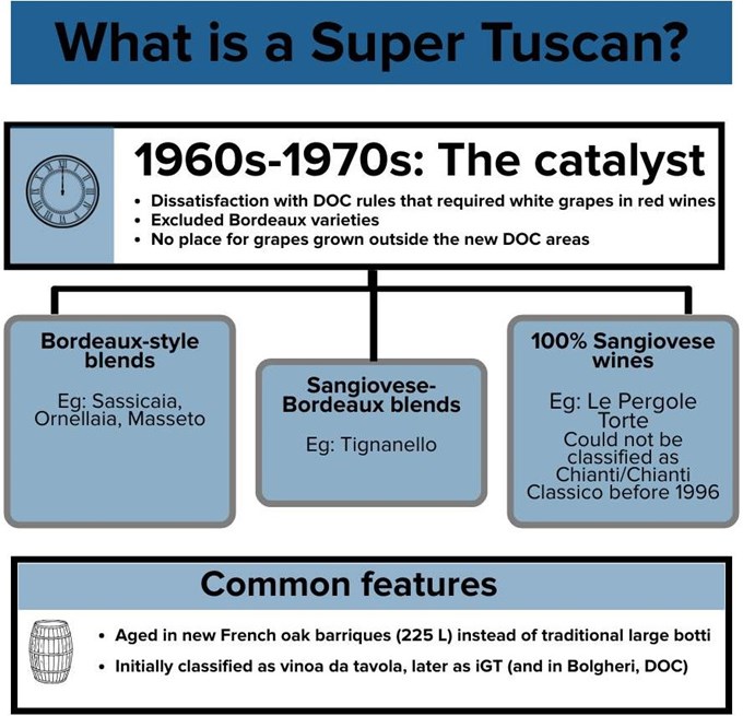 Unlike most terms used for Italian wine, Super Tuscan has no fixed meaning and is not legally defined. If a bottle of wine is sold as Brunello di Montalcino, there are unambiguous rules about where the grapes must be grown, which variety can be used and how long the wine must be aged (and even in what sort of container). None of this applies to Super Tuscan.